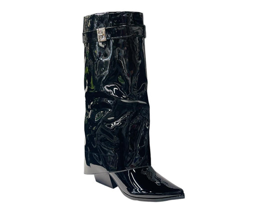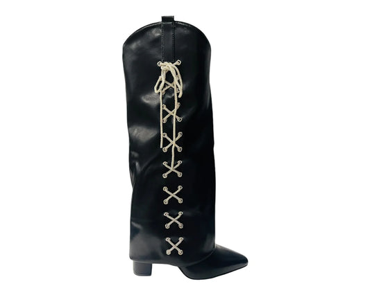 Women's Rhinestone Faux Leather Fold Over Block Heel Boots