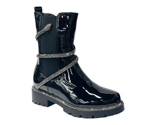 Women's Chunky Sole Faux Leather Zip Diamante Chelsea Boots Black Patent
