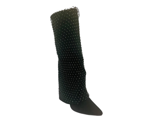 Women's Block Heel Kneel High Diamante Fishnet Boots