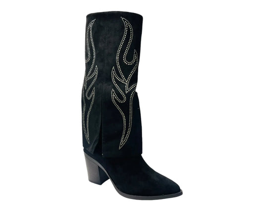Rhinestone Calf High Fold Over Faux Suede Boots