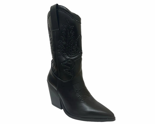 Women's Mid Calf Cowboy Embroidery Diamante Boots Black