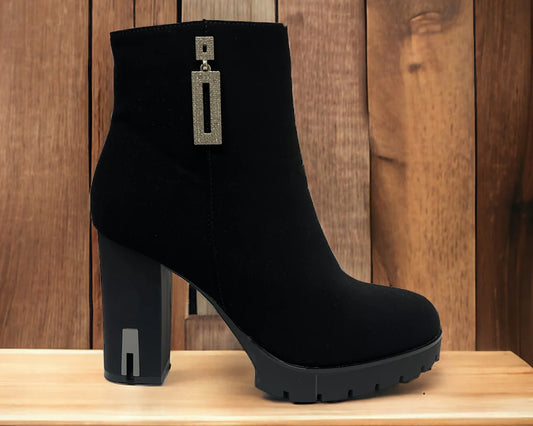 Diamante Block High Heels Zip Ankle Boots with silver details.