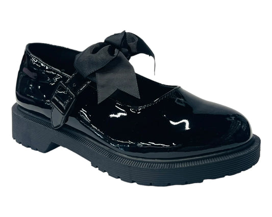 Faux Patent Leather Buckle Bow Flat Shoes