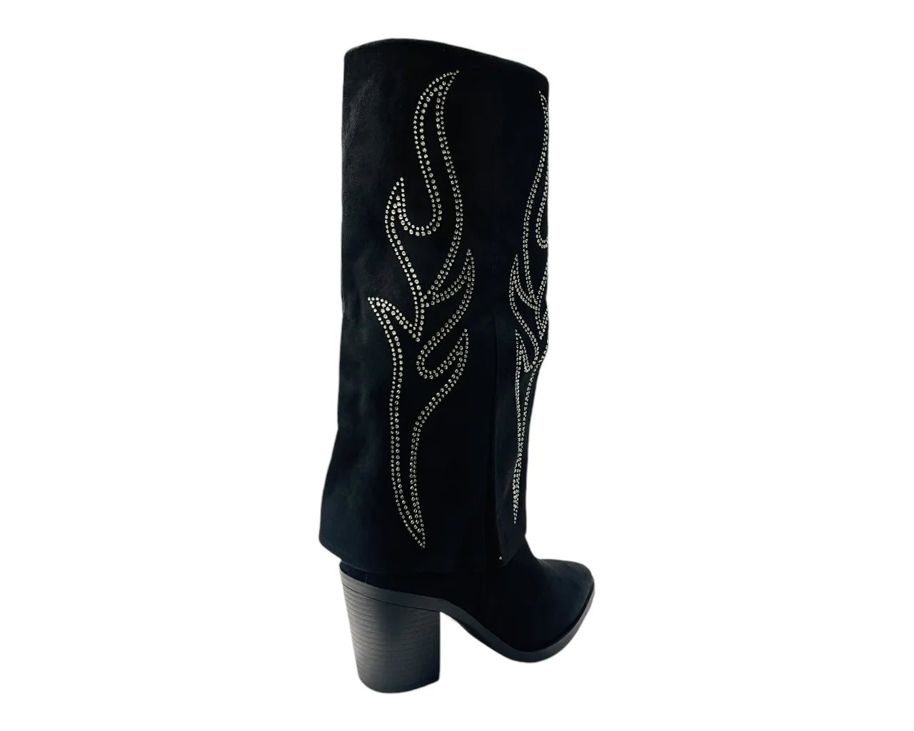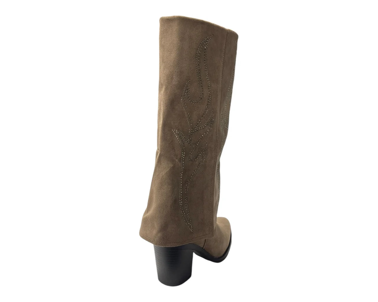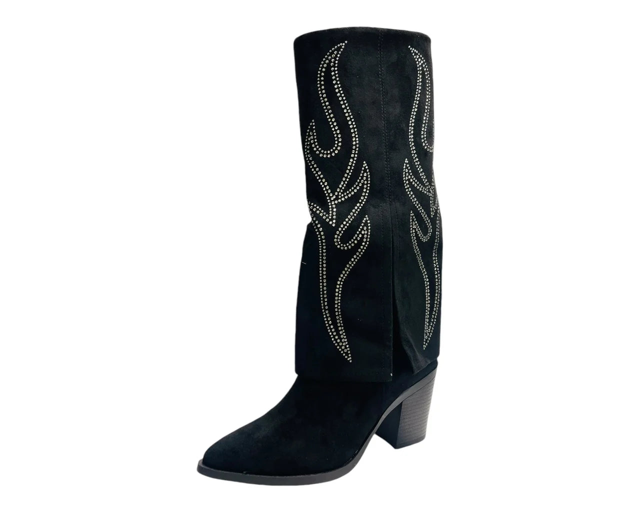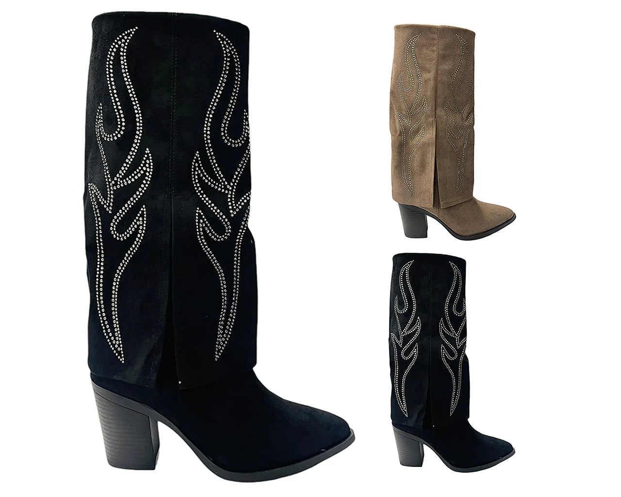 Women's calf high fold over cowboy boots feature an amazing synthetic suede material which covers the whole of the leg for maximum effect with a stunning fold over detail. The boot also feature a cute rhinestone details on top and have a cuban heel. The unique design and classic finish make them perfect for any special occasion while the comfortable fit ensures all day wear. Side zip for easy fit. Faux suede upper and fabric lining. Heel height 9cm. Quality product with stylish design.