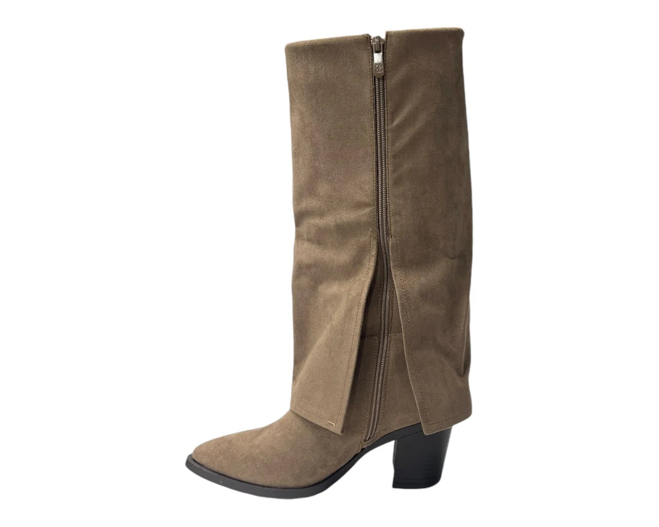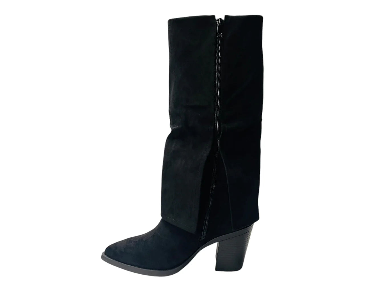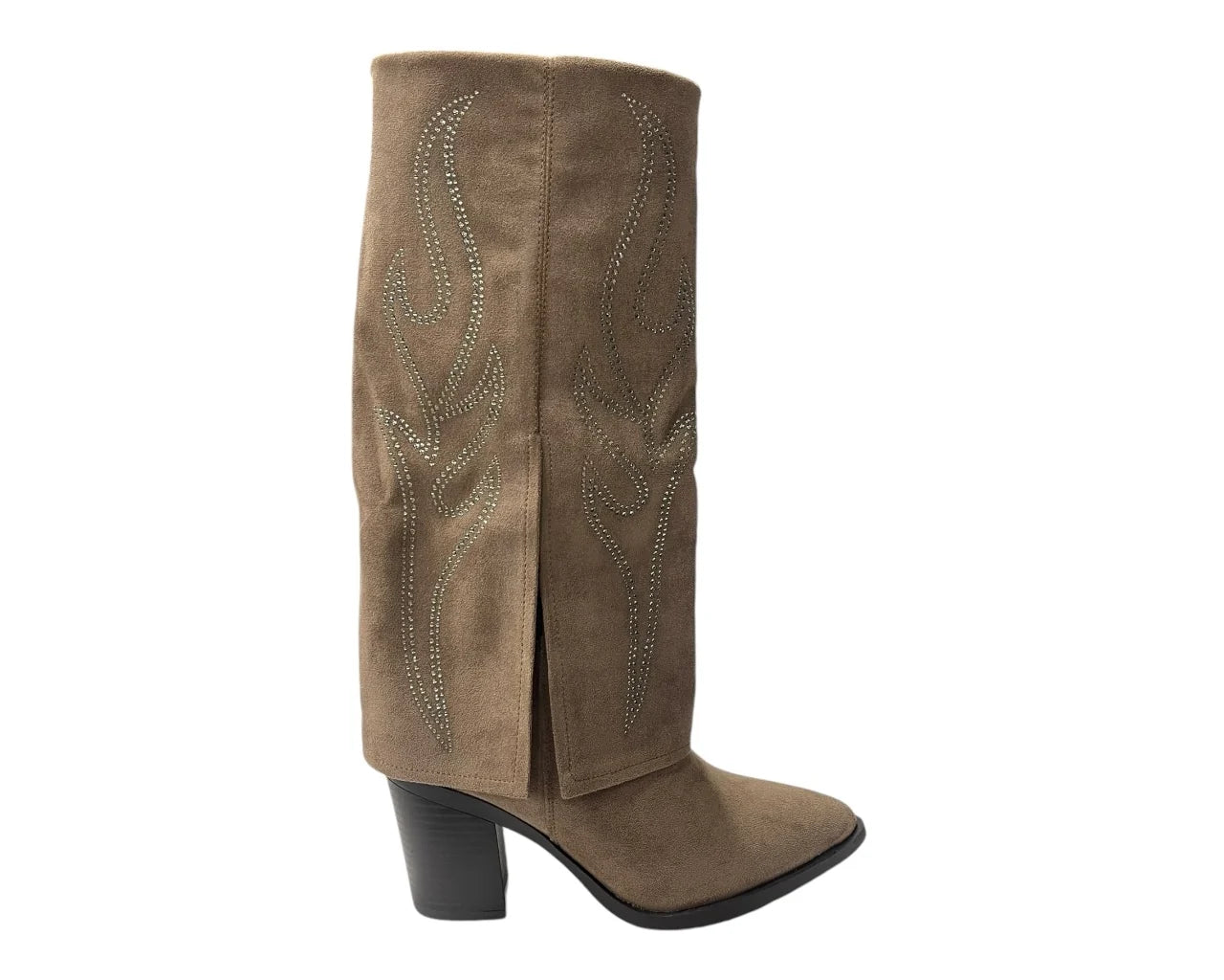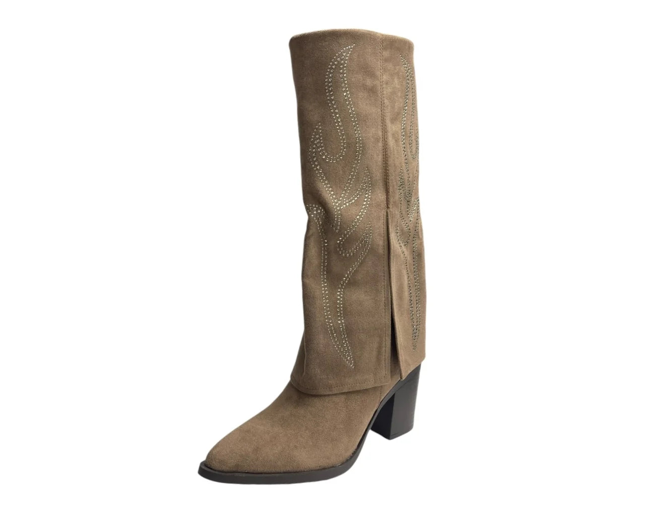 Women's calf high fold over cowboy boots feature an amazing synthetic suede material which covers the whole of the leg for maximum effect with a stunning fold over detail. The boot also feature a cute rhinestone details on top and have a cuban heel. The unique design and classic finish make them perfect for any special occasion while the comfortable fit ensures all day wear. Side zip for easy fit. Faux suede upper and fabric lining. Heel height 9cm. Quality product with stylish design.