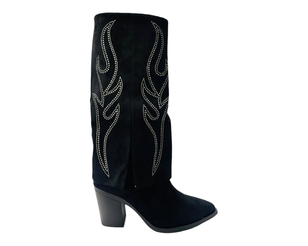 Rhinestone Calf High Fold Over Faux Suede Boots