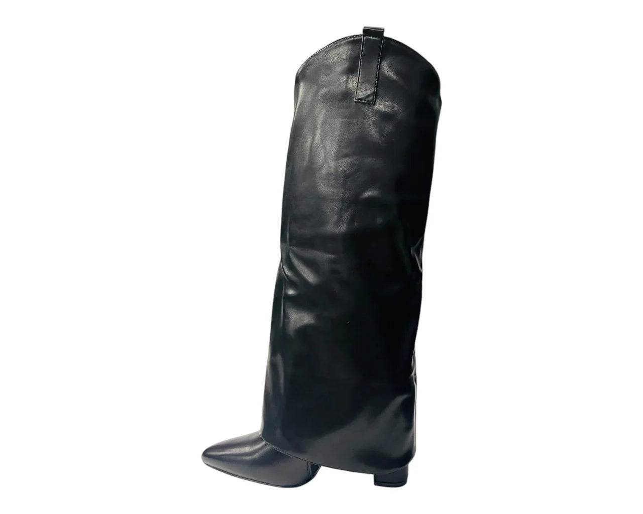 Elevate your style with our Rhinestone Faux Leather Fold Over Block Heel Boots. These boots are designed with a fold-over feature and embellished with rhinestones, adding a touch of glamour to any outfit. The block heel provides stability and comfort, making them perfect for all-day wear. Step up your fashion game with these boots.