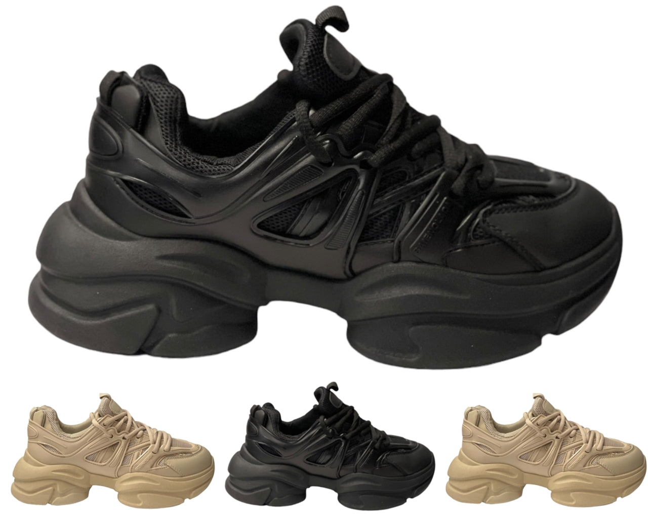 Stay effortlessly stylish and comfortable with these women's chunky sole trainers. These trainers are the perfect addition to your wardrobe, offering both versatility and functionality. Crafted with a cushioned insole for all-day comfort and a rubber outsole for added traction, these running shoes will be your go-to for both casual and active occasions. Synthetic & mesh upper. Lace-up for a secure fit. Rubber sole for comfort and traction Invest in our trainers and experience the perfect blend of style, comfort, and durability. Stay fabulous and make a fashion statement with every step you take.