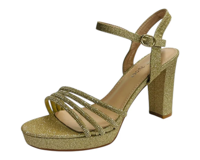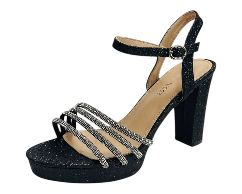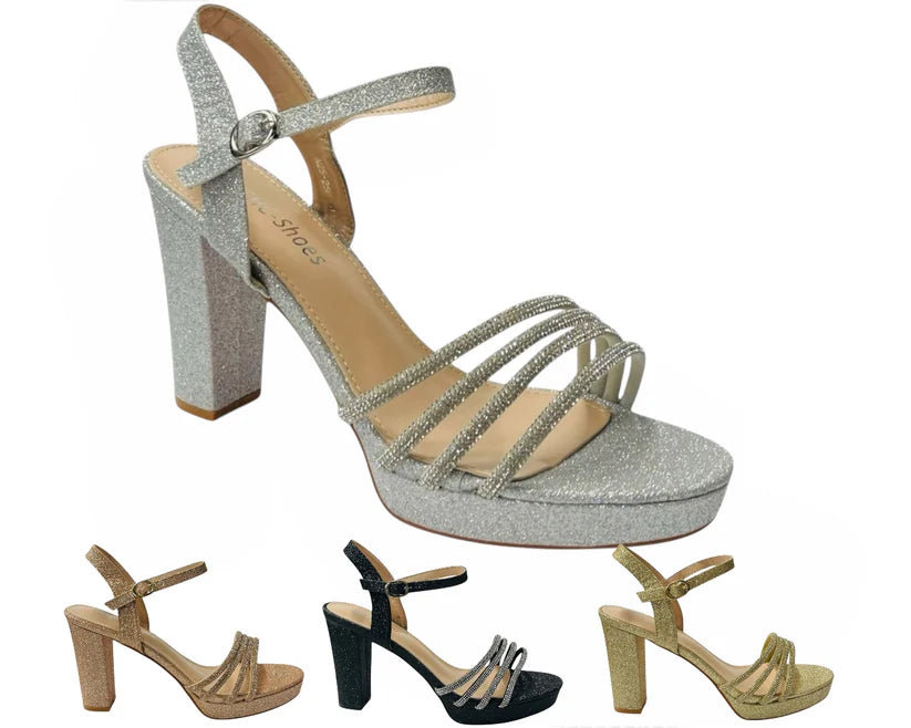 Diamante Block Heel Glitter Ankle Strap Shoes