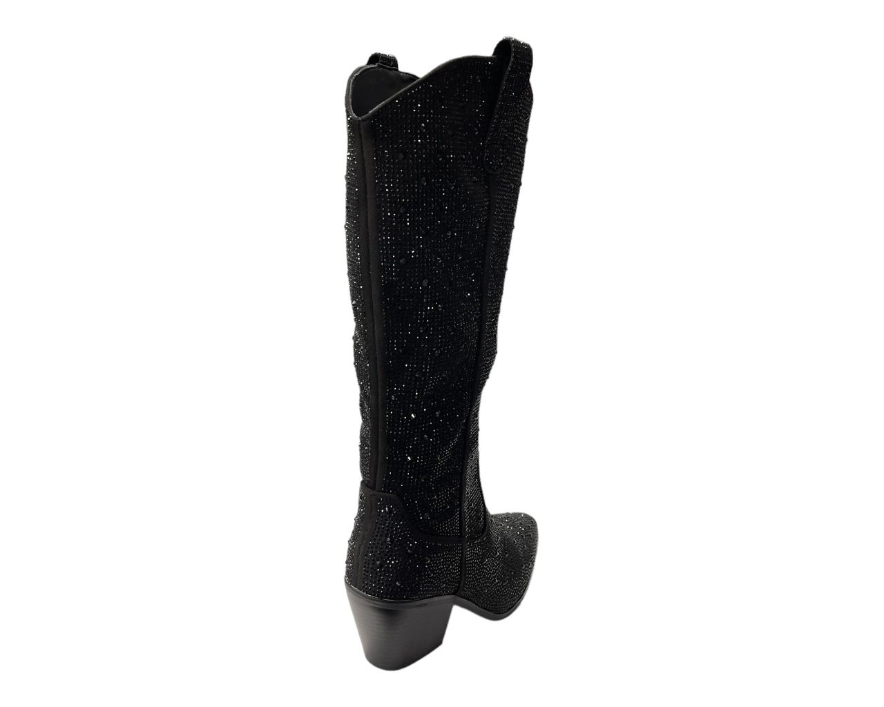 These stylish women's calf length boots are perfect for those looking to add a touch of glamour to their outfit. All over rhinestone embellishments and padded fabric lining offer both comfort and durability, The zip closure ensures a secure fit. The synthetic outsole material provides excellent grip, making them perfect for any weather condition. Heel height approx 7cm. Ideal for any occasion, stylish look and comfy feel.