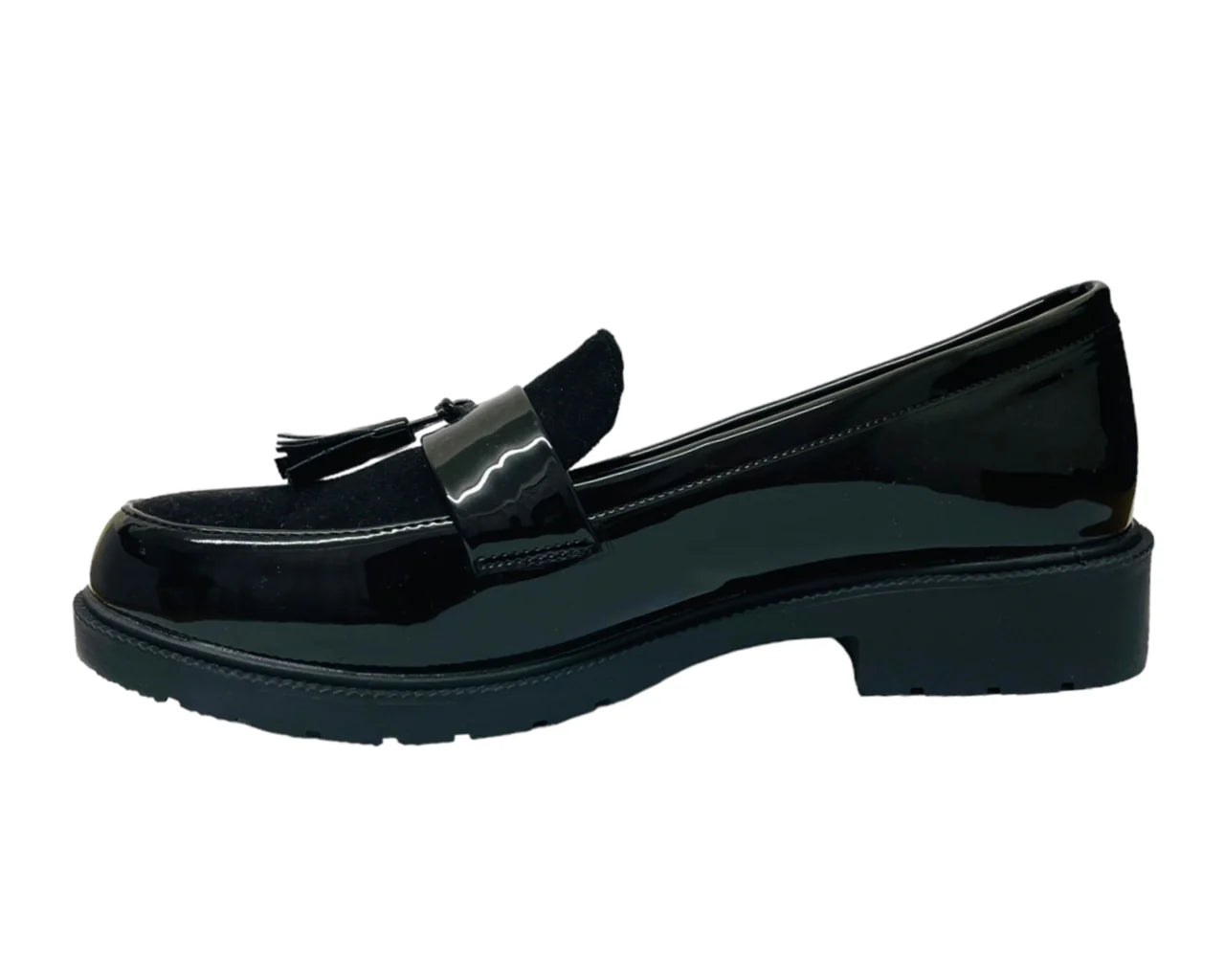 Glamorous women's faux patent tassel detail loafer flat shoes. A beautiful blend of style and sophistication, these shoes will elevate your wardrobe. Soft faux patent leather & faux suede upper. Padded inner sole & synthetic lining. Synthetic sole.