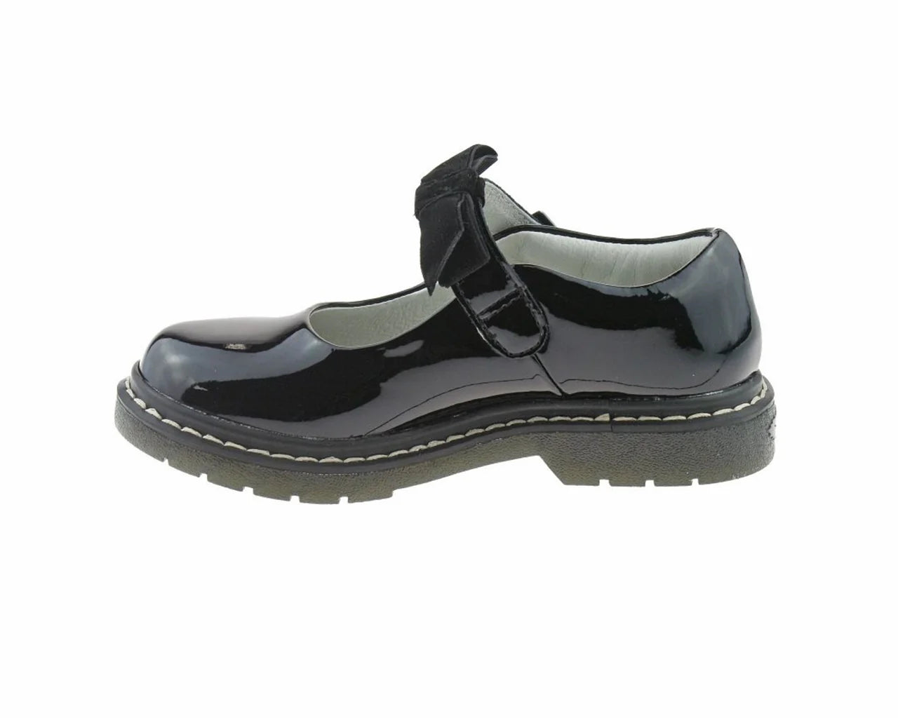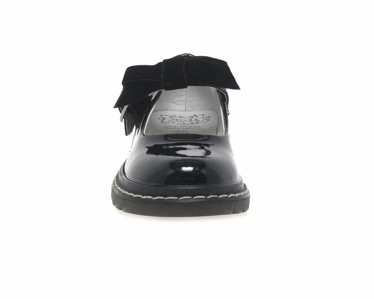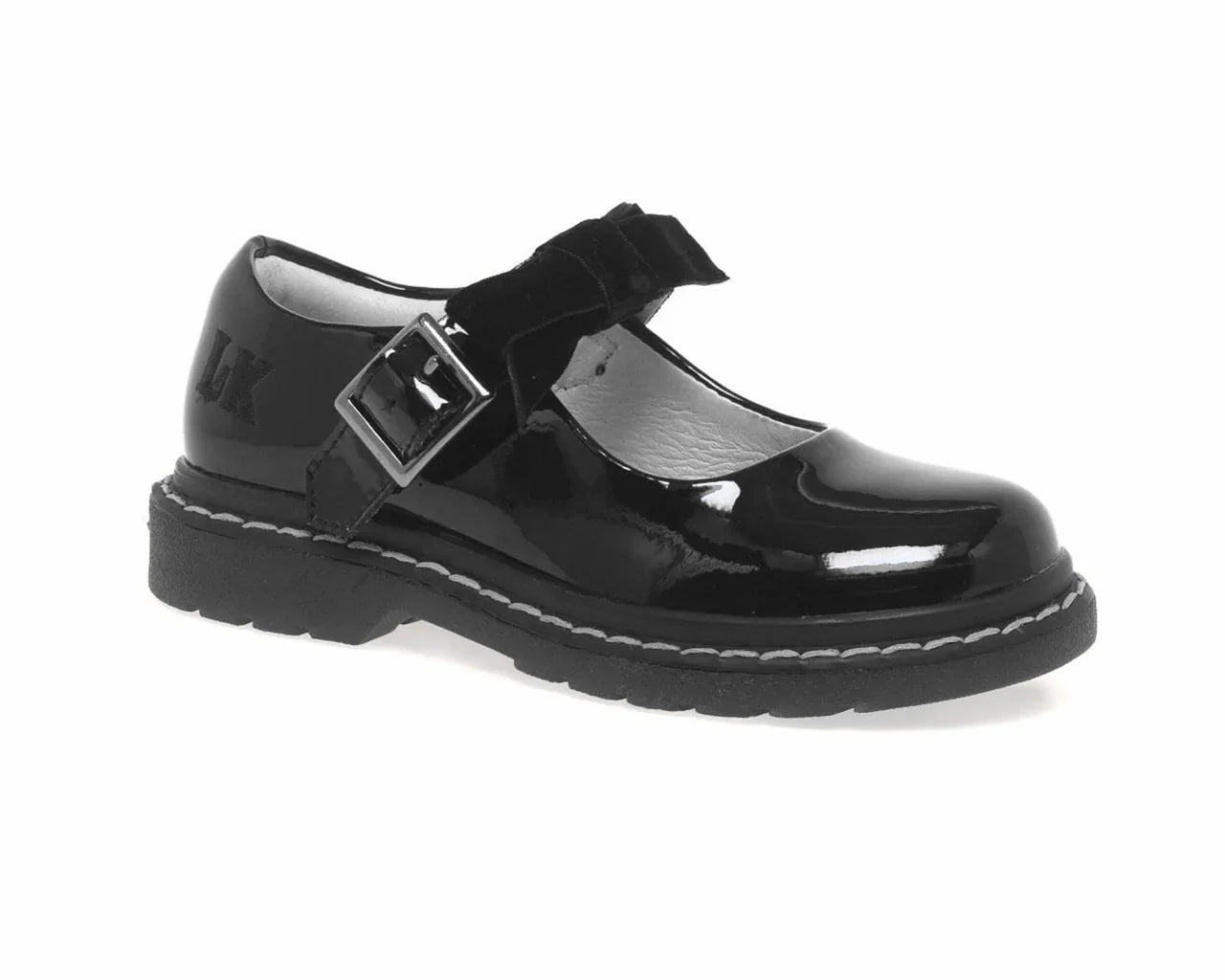 "Frankie" Beautiful Lelli Kelly school shoes in black patent, With black velour piping round the foot and a black velour removable bow. The Mary Jane strap is adjustable with a buckle and the sole is chunkier and very durable with a contrast stitch, Lelli Kelly branding is embroidered in black on to the side. Leather, Style code LKSM8286