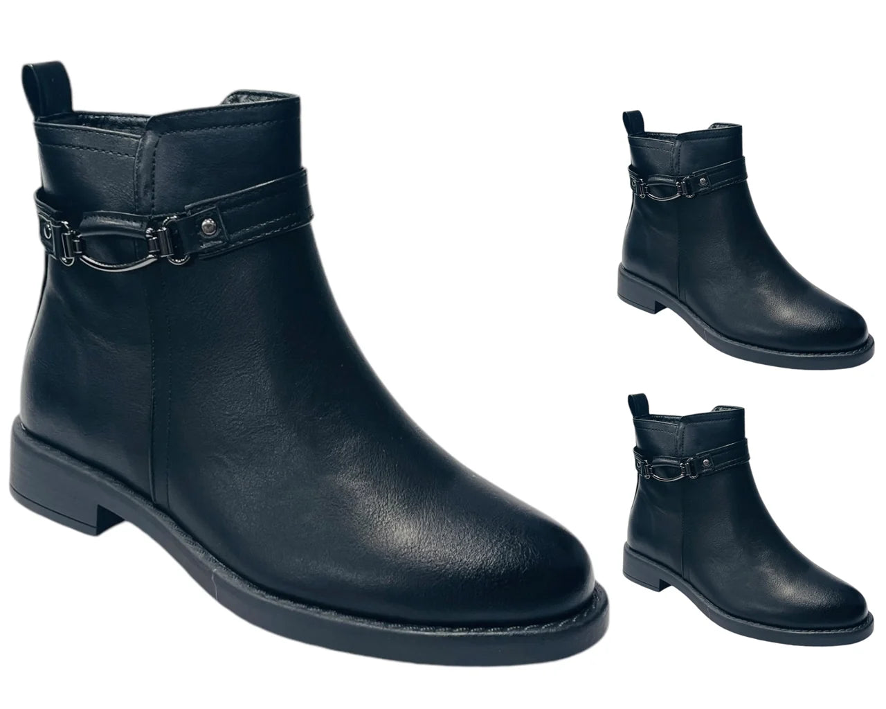 These stylish women's ankle boots are perfect for those looking to add a touch of glamour to their outfit. The faux leather upper material and fabric lining offer both comfort and durability, The zip closure ensures a secure fit, Faux leather ankle strap with hardware details. The synthetic outsole material provides excellent grip, making them perfect for any weather condition. Ideal for any occasion, stylish look and comfy feel.