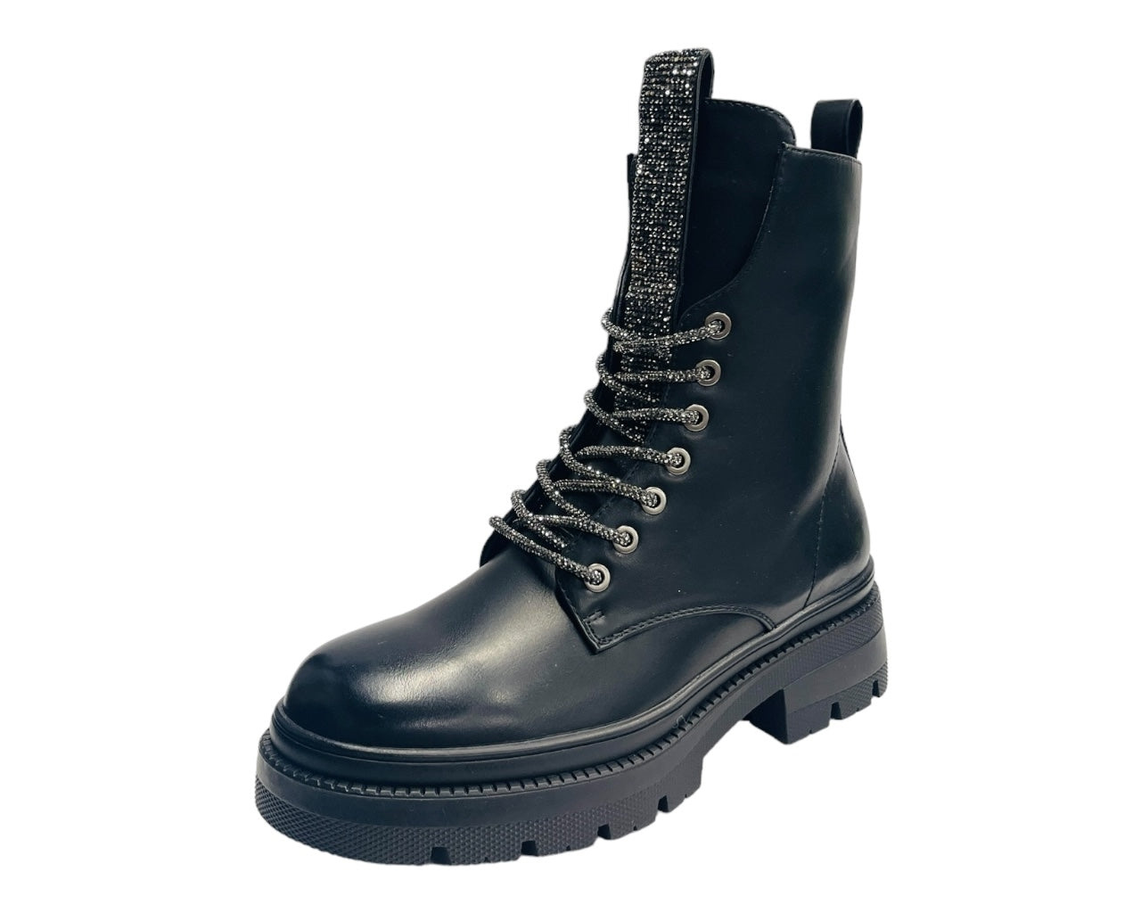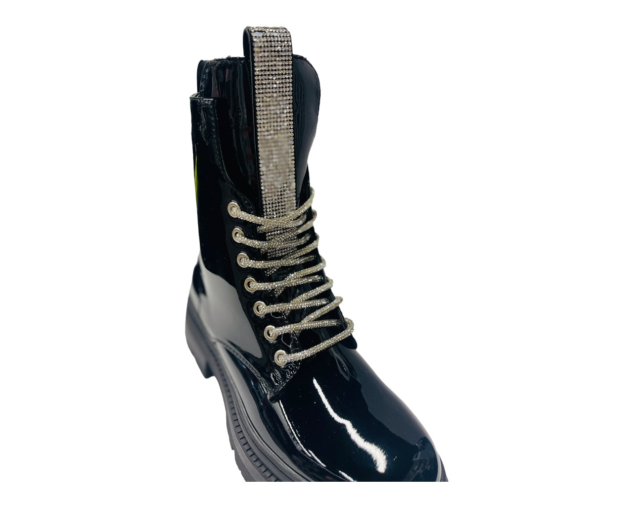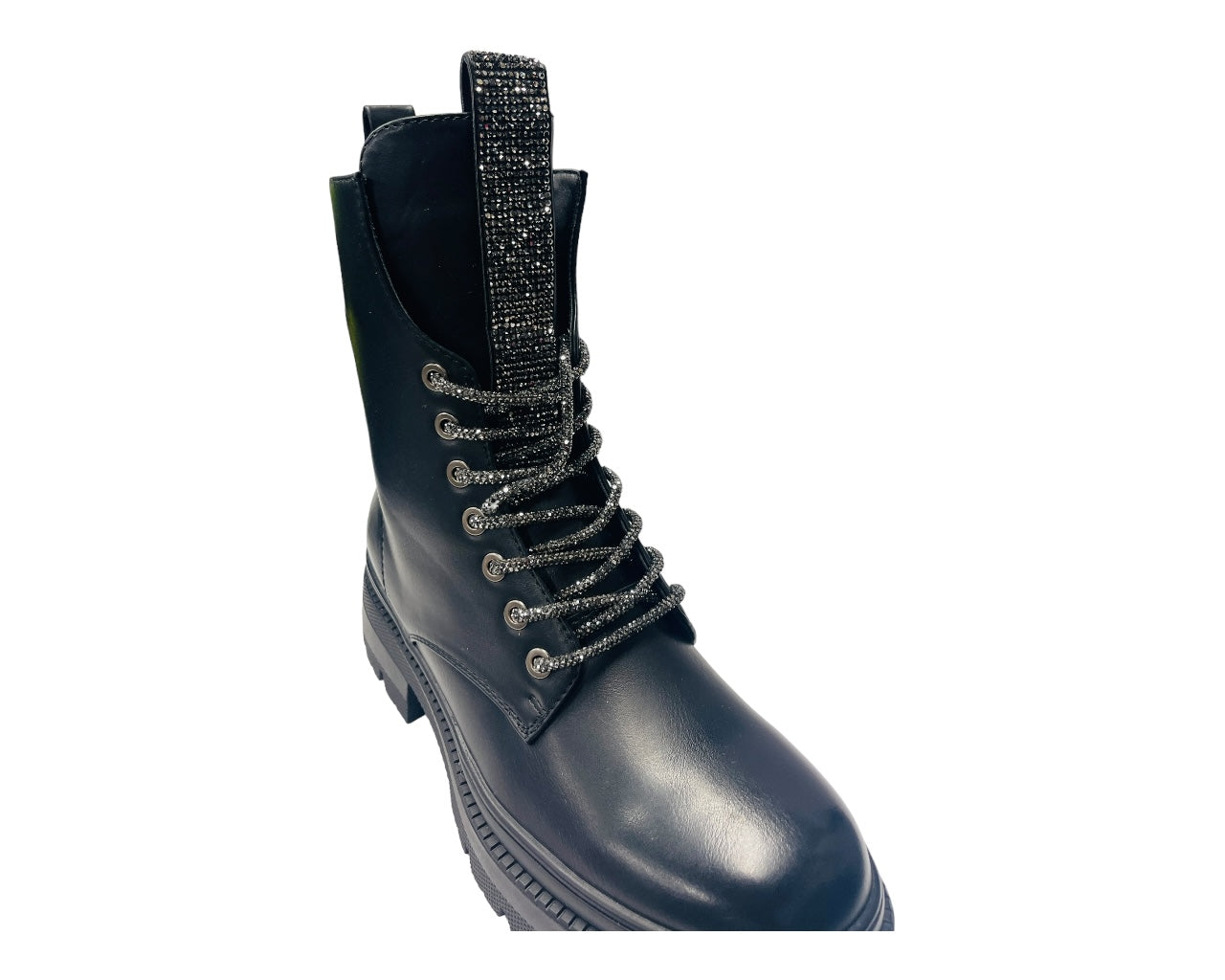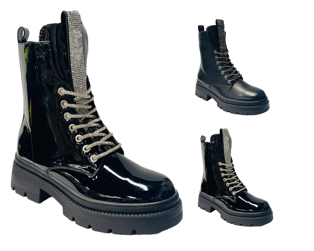 The perfect balance between urban style and a touch of shine is found in these faux leather ankle boots. These boots consist of a classic round toe design with a chunky rubber heel outsole for style and height. Laces & tongue are decorated with rhinestones to highlighting the style. Faux leather upper. Side zip for easy fit. Experience the perfect blend of style, comfort, and durability. Stay fabulous and make a fashion statement with every step you take.