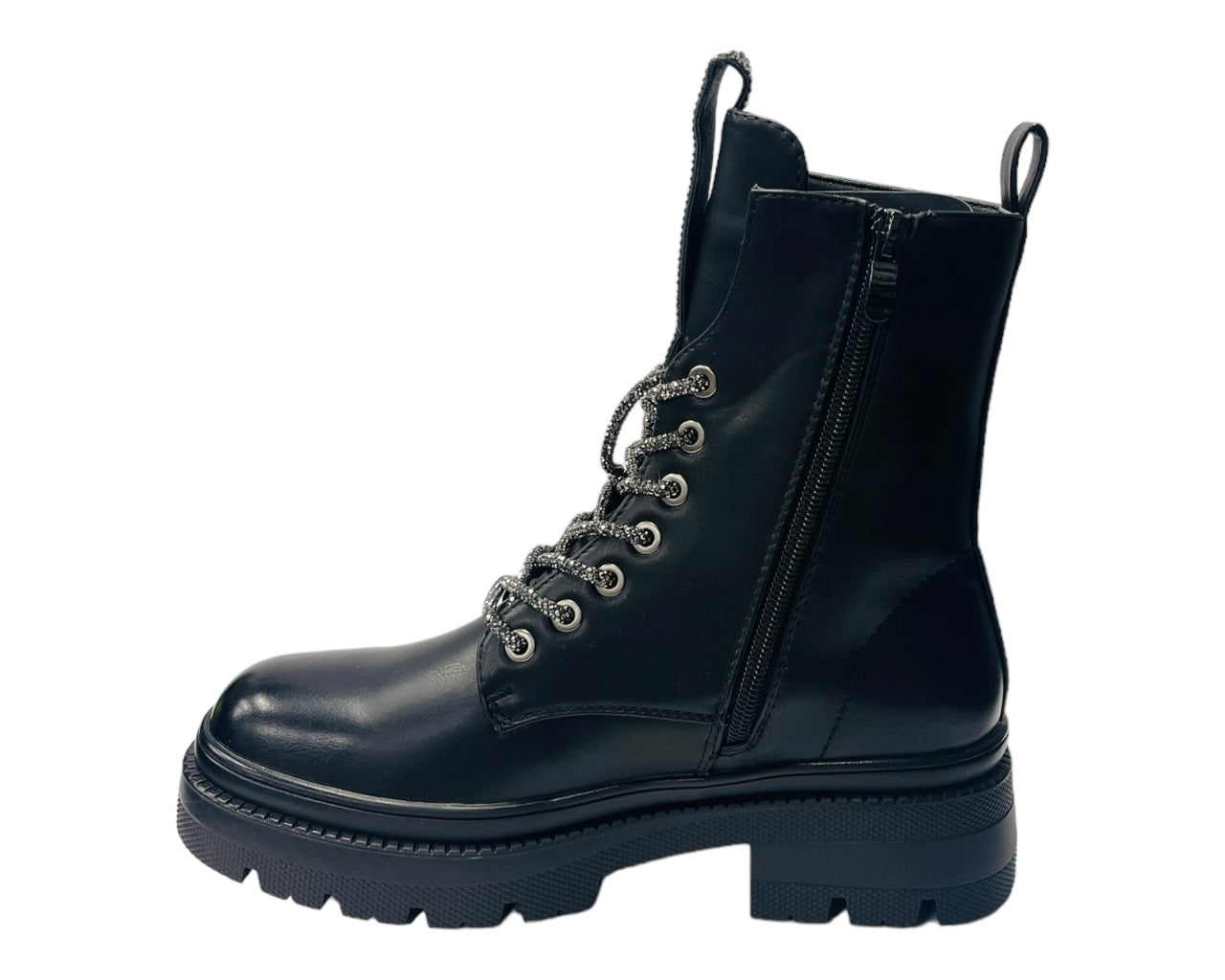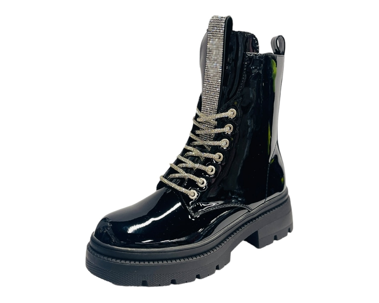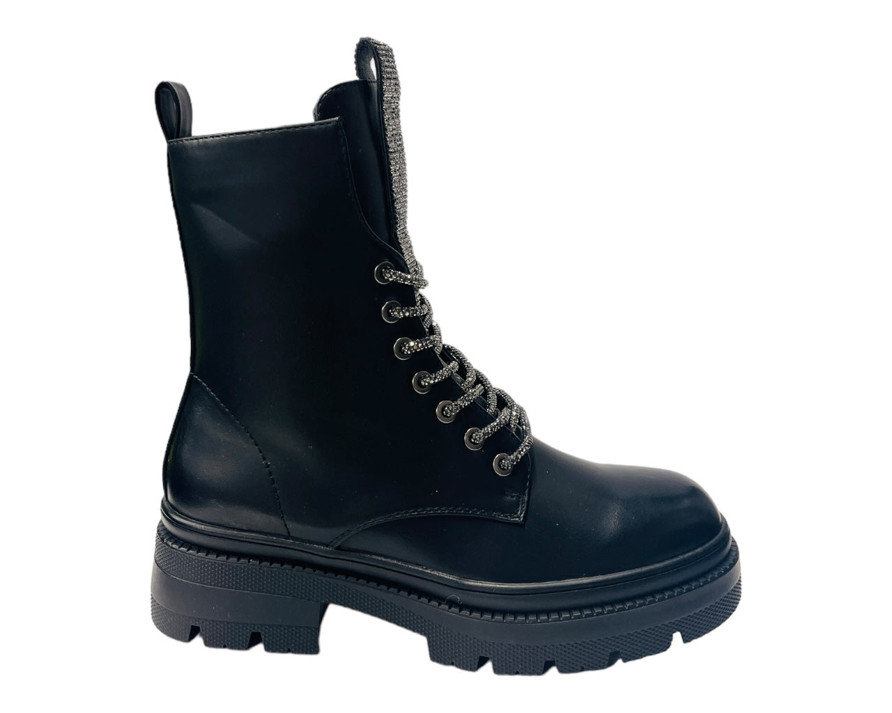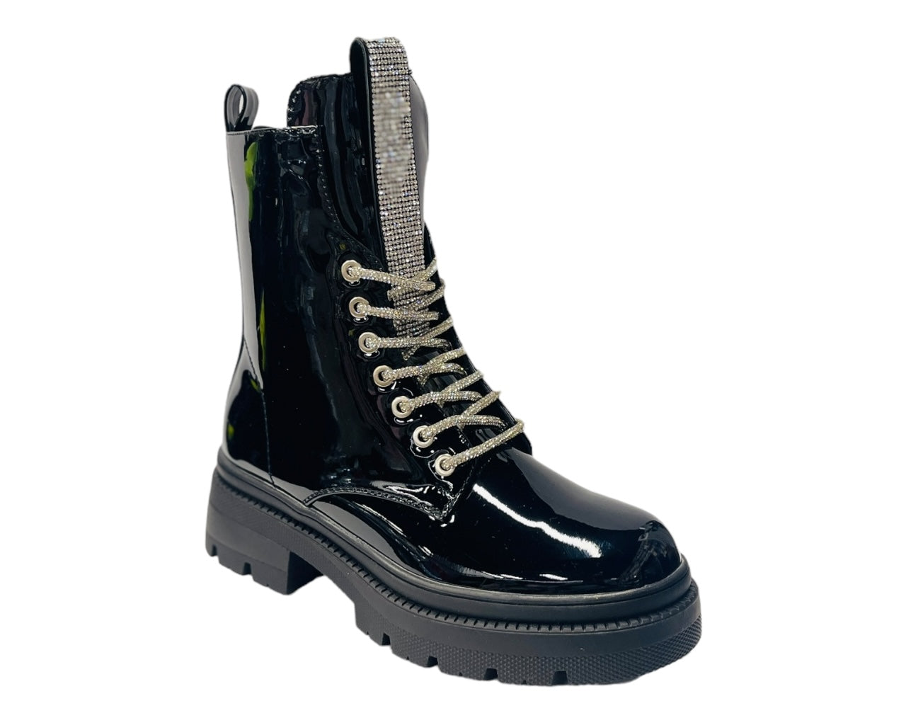 The perfect balance between urban style and a touch of shine is found in these faux leather ankle boots. These boots consist of a classic round toe design with a chunky rubber heel outsole for style and height. Laces & tongue are decorated with rhinestones to highlighting the style. Faux leather upper. Side zip for easy fit. Experience the perfect blend of style, comfort, and durability. Stay fabulous and make a fashion statement with every step you take.