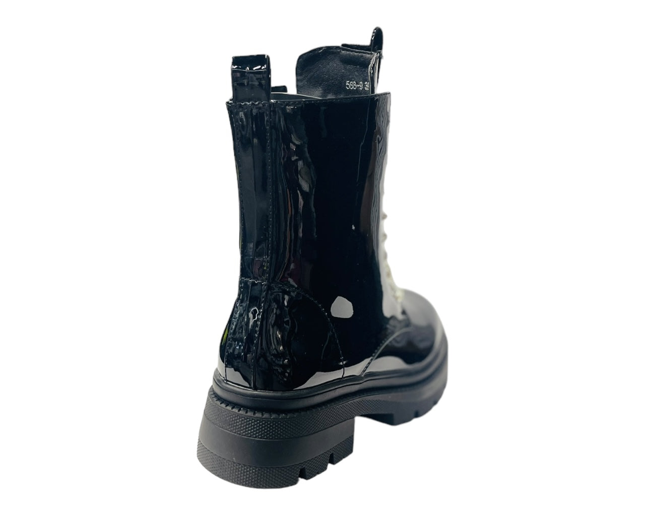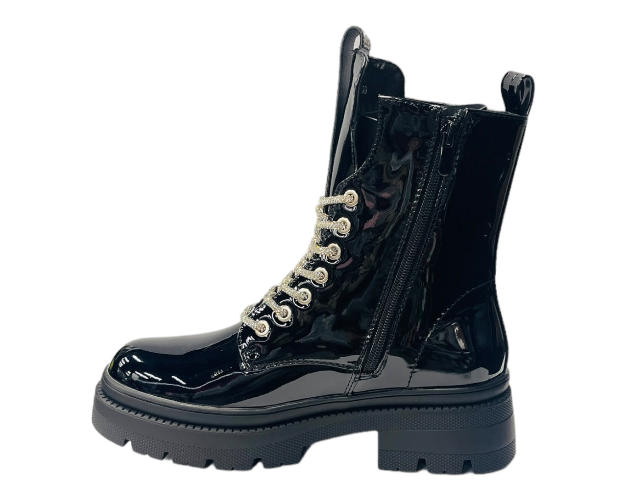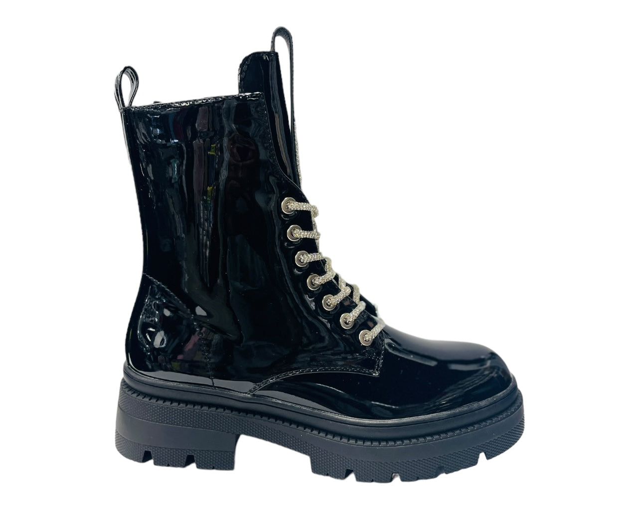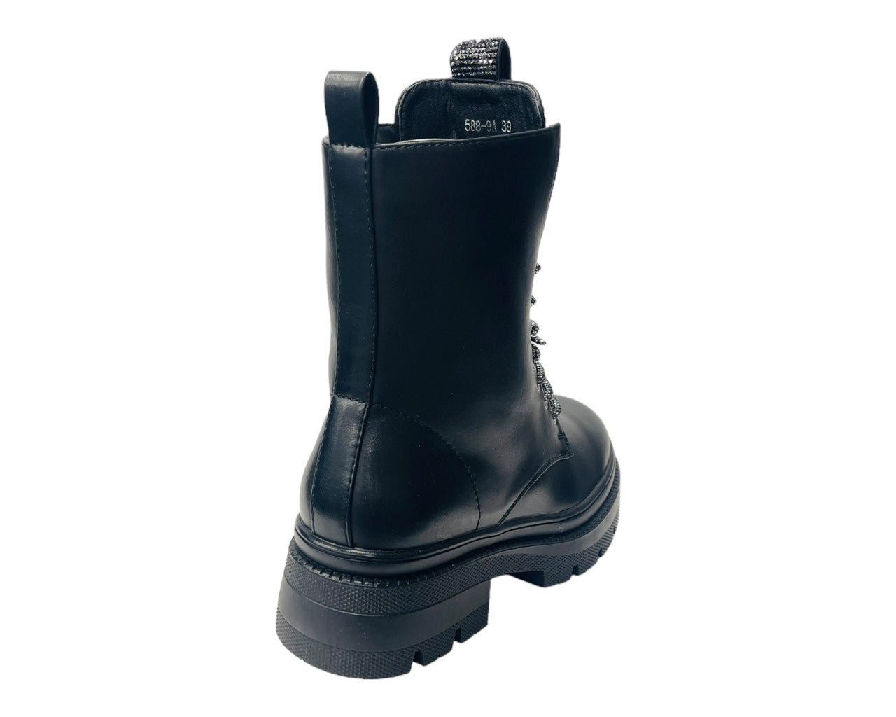 The perfect balance between urban style and a touch of shine is found in these faux leather ankle boots. These boots consist of a classic round toe design with a chunky rubber heel outsole for style and height. Laces & tongue are decorated with rhinestones to highlighting the style. Faux leather upper. Side zip for easy fit. Experience the perfect blend of style, comfort, and durability. Stay fabulous and make a fashion statement with every step you take.