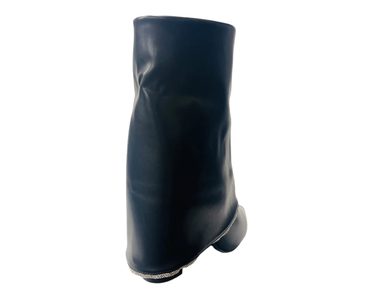 Elevate your style with these timeless and elegant ankle boots. The faux leather/suede material creates a stunning fold over detail, adorned with micro rhinestones for extra flair. With a side zip for easy fit and a 10cm block heel, these boots are a must-have addition to your wardrobe. Perfect for effortlessly elevating any outfit.